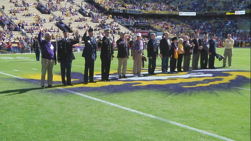 BATON ROUGE - As LSU players warmed up for Saturday's early morning game, active and retired members of the military took the field to be honored for their courage and service.