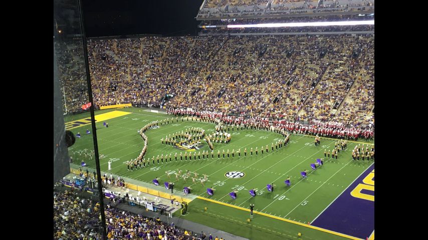 LSU Athletics reports that 98,389 fans attended the home opener at Tiger Stadium. During halftime, the LSU Golden Band from Tigerland paid tribute to victims of August's historic flooding. The band stood in multiple formations, including spelling out Louisiana, surrounding "BR" in a heart, and taking the shape of the state. More than 60,000 homes were damaged in last month's historic flooding and 13 people were killed.