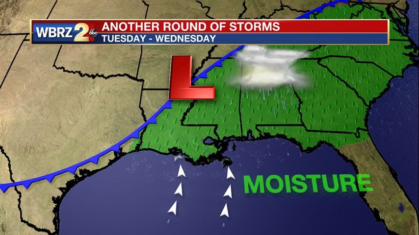 There will overall be a lull in precipitation on Monday, but another storm system will cross the area Tuesday into Wednesday. Strong to severe storms will be possible once again. Most of the WBRZ viewing area has already been highlighted in a level 2 'slight risk' for Tuesday.