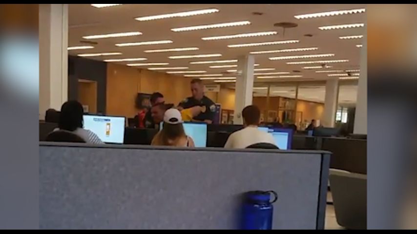 Police say a metal detector was also damaged as he was taken out of the library.