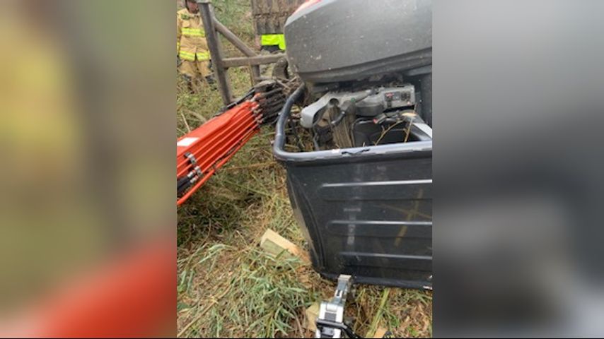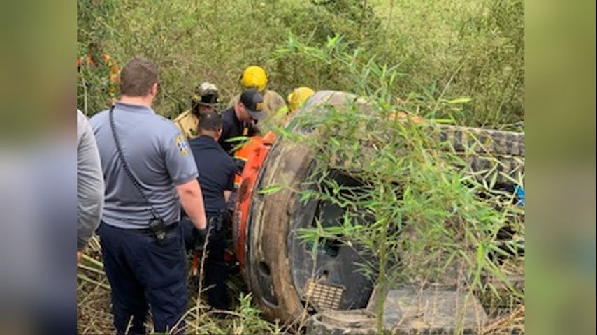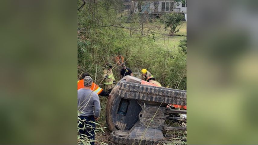 Upon arriving at the scene, crews say they found the man with his foot caught underneath the excavator after it overturned halfway into a ditch.