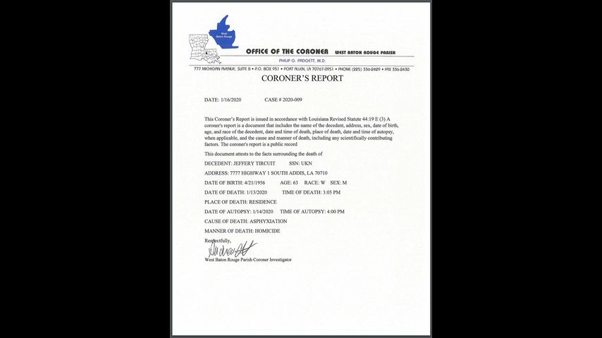Sources close to the investigation told the WBRZ Investigative Unit, 63-year-old Jeffrey Tircuit was discovered bound with a bag over his head. However, that detail was not confirmed by law enforcement or the coroner.