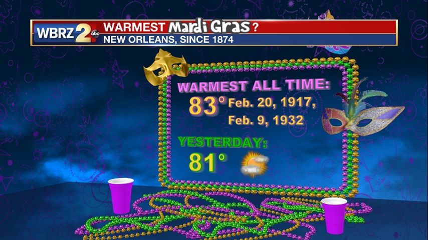 The warmest temperature was recorded on February 20, 1917 and February 9, 1932 of 83 degrees. Only 7 out of the last 147 Mardi Gras Days had temperatures of 80 degrees or higher.