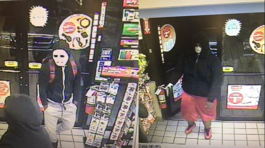 Both men were wearing black hooded jackets, and white masks. One man was wearing tan or khaki-colored pants and the other was wearing what appears to be red gym shorts.