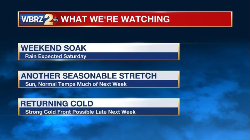Up Next: An increase in clouds is expected with an isolated shower possible on Friday, especially in the afternoon and evening. Showers will continue to increase in coverage on Saturday, which is shaping up to be wet. More than an inch of rain is possible depending on the track of the parent storm system. Even if the total rainfall is lighter, the cloudy and soggy weather may force any outdoor plans to move inside. Hopefully, the current forecast holds in clearing skies out in time for the first Baton Rouge area Mardi Gras parade—the Mystic Krewe of Mutts!