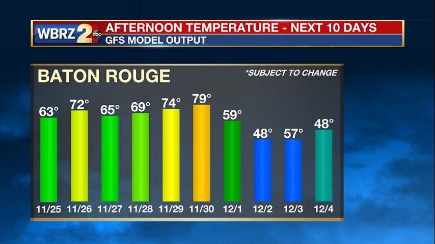 By Tuesday, change in the forecast. Precipitation likely to development as another system moves toward our region. Temperatures rise into the mid to upper 70s. This frontal boundary expected to stall along the coast or just off shore on Wednesday. As the front lifts north Wednesday night into Thursday, continued cloud cover and a isolated shower for Thanksgiving day possible as highs reach the low 70s. As you plan your Thanksgiving travel Tuesday and Wednesday, keep in mind you may have to consider a isolated shower and/or storm which could pose possible delays.
