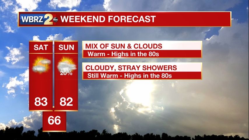 Saturday will be mainly dry. We'll have a mix of sun and clouds with temperatures in the 80s. Sunday, expect more in the way of cloud cover. The chance for an isolated shower or two will be slightly higher, around 20%. Overall, rain will not be big a concern for your weekend plans.