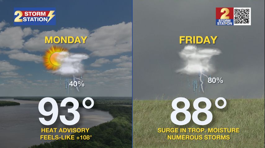 A HEAT ADVISORY will be in effect until 7 p.m. Monday for many around the Capital Area, including parts of Ascension, Assumption, East Baton Rouge, Iberville, Livingston, St. James, Tangipahoa, and West Baton Rouge Parishes. Expect feels-like temperatures to sit in the 105-108° range for several hours during the afternoon, possibly reaching 110° in some neighborhoods. Drink plenty of fluids, wear light clothing, and take breaks during the hottest parts of the day.