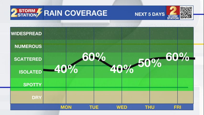 What to look out for: Rain chances on Monday are spotty and brief, not widespread or heavy. While showers and isolated thunderstorms may develop in the heat of the afternoon, they will generally be short-lived and scattered in nature. No organized severe weather is expected, but localized downpours may briefly reduce visibility.