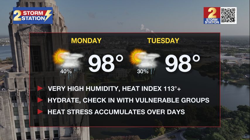 Today & Tonight: With peak feels-like temperatures forecast to top out as high as 115-117° Monday afternoon, another extreme heat warning has been issued for parts of southern Louisiana from 10am-7pm on Monday. Parishes not included in the warning are still under a Heat Advisory today. Similar to conditions over the weekend, Monday will see a mix of sun and clouds along with the heat and humidity. The only relief one can hope for will be from passing afternoon storms that will arrived in a scattered fashion today.