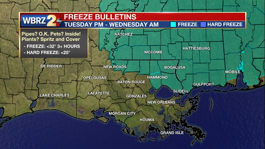 A Freeze Watch has been issued for areas north of Baton Rouge heading into Wednesday.