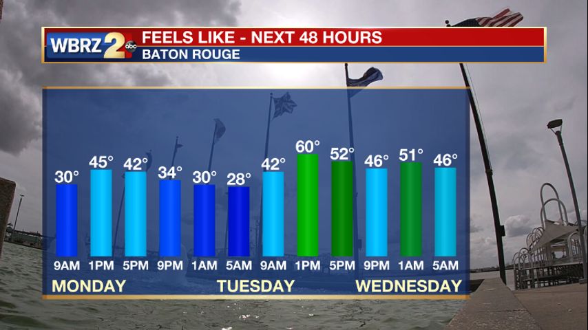 Up Next: Tuesday morning will bring temperatures near freezing with areas further north below 32° and areas further south just above freezing. Afternoon temperatures will be in the upper 50s with clear skies. Wednesday morning will be in the 40s and the afternoon temperatures will reach the low 70s. The next cold front will approach the area on Thursday. That will send temperatures back into the 30s on Friday morning, but the Baton Rouge area is expected to stay above freezing. Temperatures will rebound fast with 70s in the forecast on Saturday and Sunday. A few scattered showers expected over the weekend too. Click here to see the 7-day forecast.