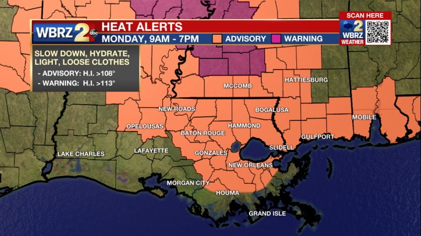 Today & Tonight: A Heat Advisory has been issued again today for the heat index values that are set to climb to near 110 degrees. Be sure to drink plenty of water and take frequent breaks from the sun while working outside. A few showers will move through this afternoon, areas north and east of Baton Rouge are more likely to see rain today. Any showers will only offer temporary heat relief. Overnight temperatures will be in the mid-70s.