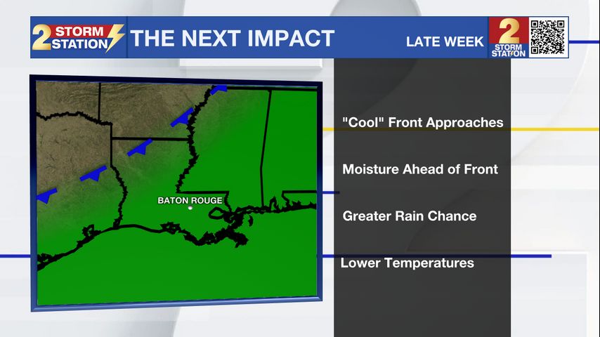 Up Next: The forecast through Wednesday will be very typical of the summertime. Hot and humid with pop up storms. This pattern will start to shift by Thursday. A "cool front" will approach the area, with moisture pooling ahead of the front. This front will help to trigger scattered to numerous activity. Along with greater rain chances, temperatures will move down to the lower 90's. This pattern will last into the weekend.