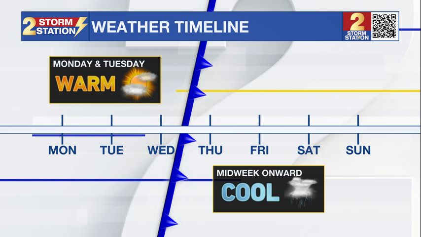 We’re looking at a week of two different weather stories. Things are going to start off very warm as the rain dries up and the heat takes over. By the end of the week, a front will send temperatures crashing and bring the rain back into the forecast.
