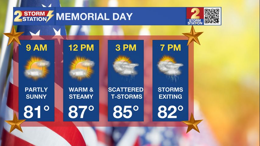 Memorial Day: Through the early afternoon hours, expect warm and humid temperatures quickly heating into the upper-80s, near 90 degrees for a high temperature, under a mix of sun and clouds. By Monday afternoon, a line of storms will approach the Capital Region from the northwest. Scattered storms are likely to move through sometime Monday afternoon, with the greatest coverage of rain along and north of the interstate. Within any of the passing storms, watch our for cloud-to-ground lightning, heavy downpours, gusty winds, and small hail. By nightfall, radar activity will quickly die down. Overnight conditions will be warm and muggy, falling near 74° in Baton Rouge.