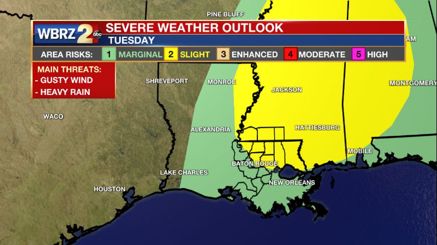 Up Next: We are expecting a cold front around sunrise tomorrow. This one will be coming in with a few showers and storms. Some of the storms could be on the stronger side. There is a severe weather outlook for the entire WBRZ viewing area ranging from a level 1/5 Marginal to a level 2/5 Slight risk for severe storms. The largest severe risks are heavy rain and wind gusting above 60mph. There is also a risk for hail and spin up tornadoes. Stay connected to the Storm Station and be sure to have the most up to date information before you leave Tuesday morning. Any showers will likely slow down your morning commute.