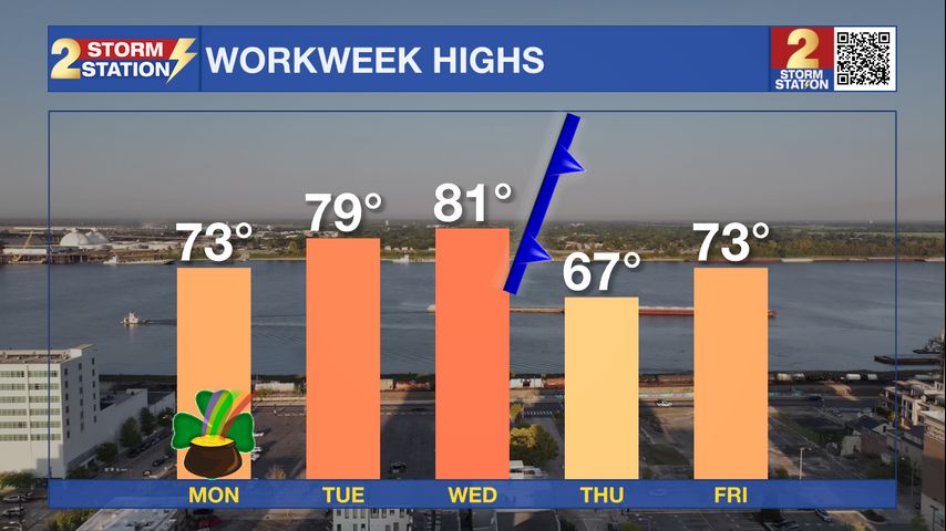 Up Next: With sunshine continuing to dominate Tuesday, highs will be a few degrees warmer, in the upper-70s. A few high clouds may sneak in on Tuesday with a mix of sun and clouds expected on Wednesday. Wednesday will be the warmest day of the workweek with highs near 80°. A cold front will move through late Wednesday night, sending a very temporary cool down to the area, but lacking in enough moisture to produce any rain. Thursday will see afternoon temperatures in the upper-60s with highs quickly returning to the 80s by the weekend.