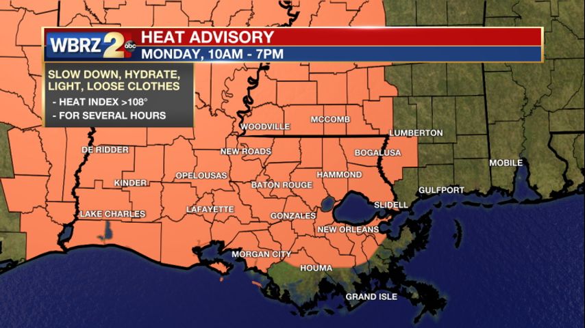 Today & Tonight: Monday is now day four with a heat advisory for south Louisiana. The heat index is expected to be between 108 and 112 degrees this afternoon. If you need to be outside today be sure to drink plenty of water and take frequent breaks in the shade. A few showers will be around this afternoon, but they will be brief. Overnight the steam continues with temperatures in the mid-70s.