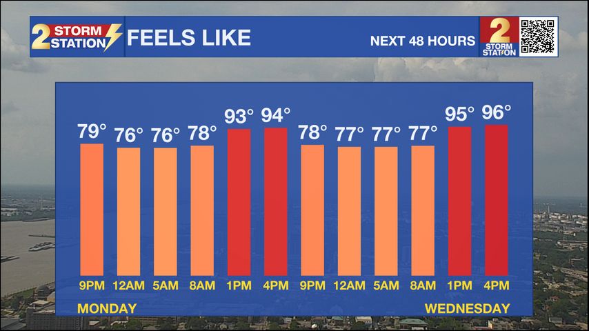 Up Next: Wednesday and Thursday will feature a mix of sun and clouds and a continuation of the heat and steam. Expect high temperatures in the low-90s and low temperatures in the low to mid-70s. Those sticky mornings are often an indication of elevated humidity which will also cause afternoon temperatures to feel a bit warmer than the display on thermometers—heat indices could near 100 degrees.