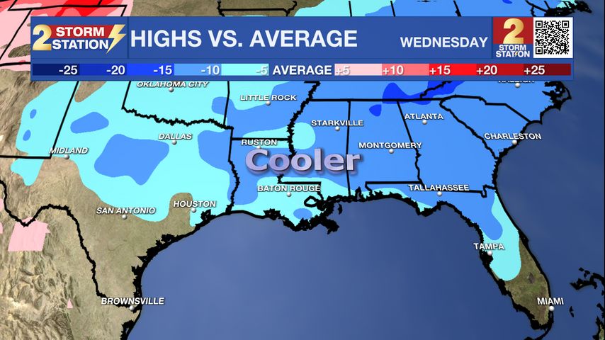 The front mentioned above will stall out in the capital area on Tuesday. It might even drift north into the afternoon. Cooler and drier air will sit north of the boundary, vice versa for areas south. Know that Tuesday has the potential to be a warm and muggy day. Should your town find itself north of the front, you'll get a head start on experiencing cooler weather. That is on the table for areas north of Baton Rouge and into southern Mississippi.