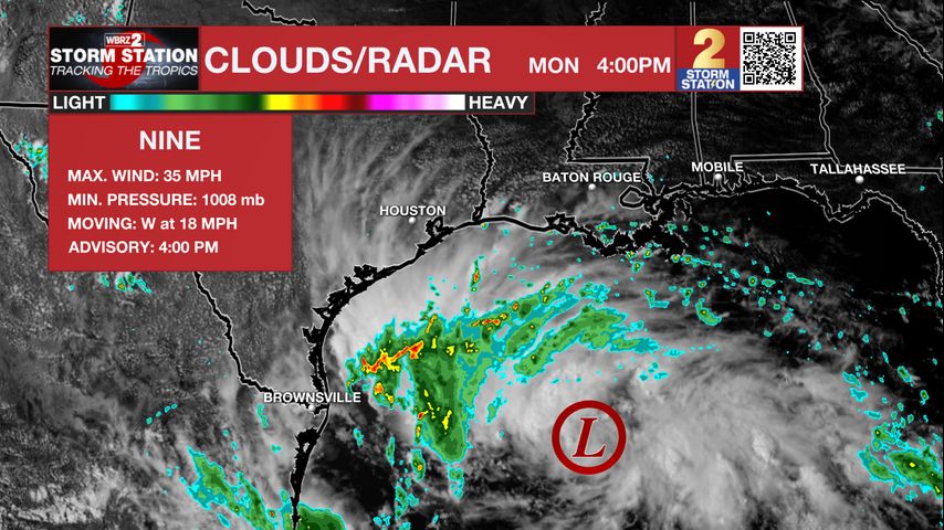 Tonight & Tomorrow: A weak tropical system, designated as Potential Tropical Cyclone Nine will continue racing west across the Gulf of Mexico overnight. Well south of the local area, this system will only provide a few extra clouds and possibly a rogue shower. Low temperatures will stop near 80 degrees. On Tuesday, the tropical system will move farther away to the southwest taking any low rain chances with it. Skies will be partly sunny. High temperatures will top out near 100 degrees with enough humidity for feels-like temperatures between 107 and 113 degrees.