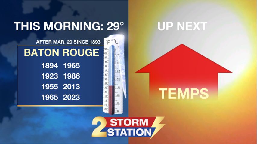Metro Airport in Baton Rouge bottomed out at 30 degrees on Monday morning. With records going back to 1893, the Capital City has only hit 30 degrees or lower 8 times on or after March 20. Those events happened in 1894, 1923, 1955, 1965 (twice), 1986, 2013 and 2023. Gradual warming is expected through the weekend, ending the early spring cool spell.