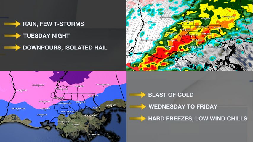 There are two weather impacts to monitor this week. First, a storm system is expected to bring an inch or two of rain and possibly even some hail on Tuesday night. Second, a big temperature drop will follow that system with low wind chills hard freeze conditions for some areas on Thursday and Friday morning.