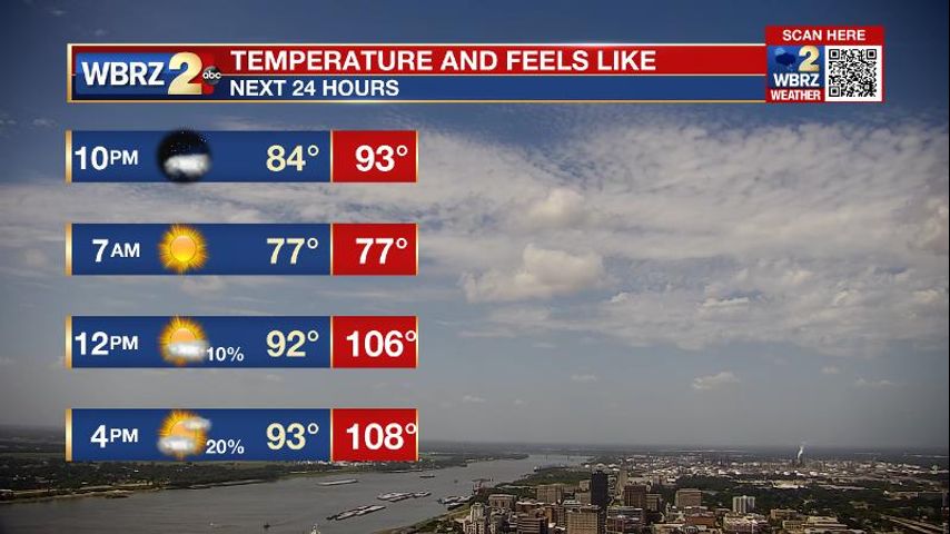 Next 24 Hours: Another warm, muggy and uncomfortable night is ahead. Any clouds will gradually diminish to mostly clear skies. Low temperatures will stop around 76 degrees. Tuesday will also be hot and humid. High temperatures will top out around 94 degrees with feels-like temperatures between 105 and 110 degrees. A pop up shower or thunderstorm is possible in the afternoon beneath otherwise mostly sunny skies.