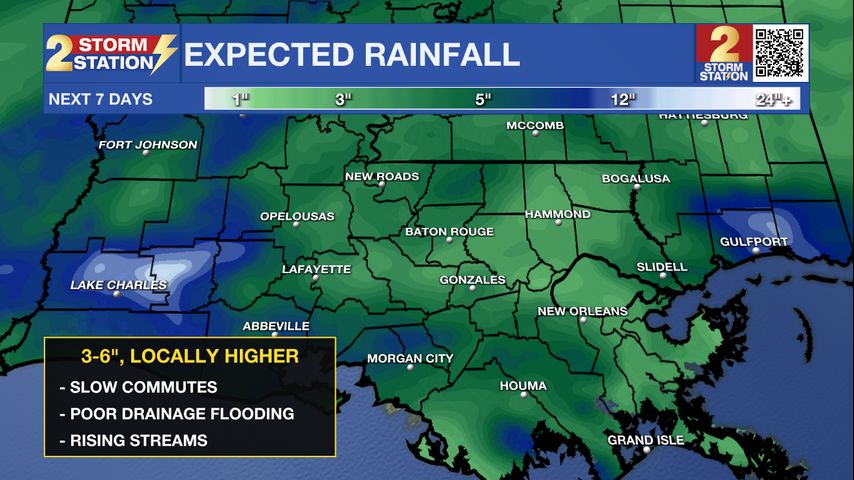 3-6” of rain is possible across southern Louisiana in the next week, with locally higher amounts in select areas. Another wave of showers and storms is possible on Friday night and early Saturday. Behind that system, we’ll dry out and cool off for the weekend.