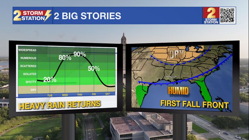 There is a lot to follow in the Storm Station 7-Day Forecast with multiple impacts ahead. First, the middle part of the workweek will be quite wet with rounds of showers and thunderstorms. Second, the first fall front of the season is slated to move through early in the weekend.