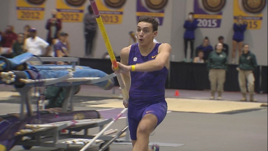 BATON ROUGE - For the first time as a collegiate athlete, LSU pole vault phenom Mondo Duplantis competed in Baton Rouge and set a Carl Maddox Field House record of 5.87 meters (19’ 3”).
