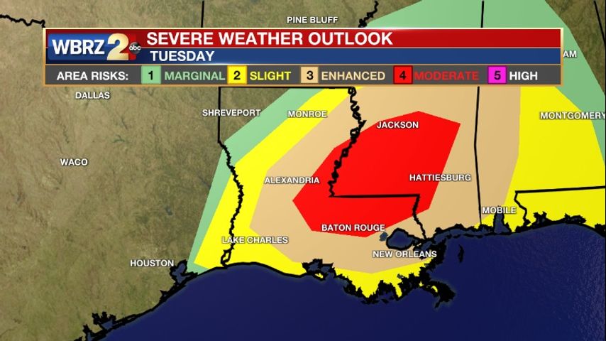 A significant risk of severe weather is becoming more likely across south Louisiana and southwest Mississippi on Tuesday. We are now in a Level 4/5 (Moderate Risk) for severe weather. SPC notes the potential for strong tornadoes. pic.twitter.com/FsWl90MDC2