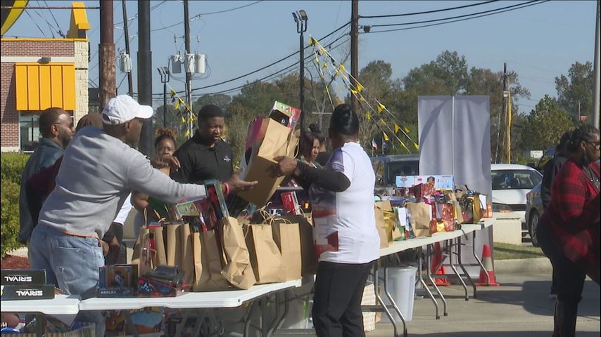 Sunday morning, cars lined up along Greenwell Springs Road to receive free toys for their families this holiday season, courtesy of the Montrell Jackson Foundation.
