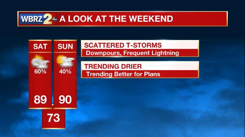 An upper level trough will extend from the Mid-Mississippi River Valley to the central Gulf Coast through Saturday. This will help create more shower and thunderstorm activity through the upcoming weekend. Daytime heating will still be a key driver of precipitation locally, but there are a few caveats. A front is stalled out from North Carolina to Oklahoma. This boundary will not be close enough to the local area to directly enhance development but if any storm complexes can drift south away from it, they could feasibly make it into southwest Mississippi and southeast Louisiana—nighttime included. At this time, forecast models continue to show very little in the way of vorticity maxima, or upper disturbances, that could also enhance action. Sometimes these are subtle and hard for models to detect so this will be evaluated with remote sensing on a day-to-day basis. Increased moisture in the atmosphere will allow rain amounts to be a bit higher than earlier in the week. Some locations could easily pick up 2 inches in an hour. The general rule of thumb will be 50 to 70 percent coverage of showers and thunderstorms, primarily during the afternoon hours Friday to Sunday. Downpours and frequent lightning can occur in any storm this time of year. On Friday and Saturday, strong winds cannot be ruled out either. By early next week, a ridge is expected to build back into the area from the east, once again curtailing rain coverage.