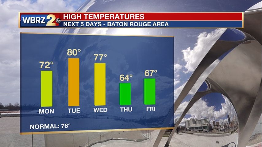 Tuesday, a boundary will move inland as a warm front, creating a few showers and even a thunderstorm or two. Temperatures will warm into the 80s once again. Then on Wednesday, a strong cold front is expected to push through southeast Louisiana. We will have widespread showers and thunderstorms ahead of the front, then behind it, cooler and drier air will filter in.