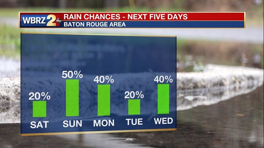 Saturday will be the pick of the weekend - with only a slight chance of a shower. Sunday, a weak front will move through the region, bringing showers and a few thunderstorms. Our weather pattern will stay unsettled into Monday, before we get a brief break from the rain on Tuesday. Wednesday, a cold front is expected to push through southeast Louisiana. We'll get some rain ahead of the front, then behind it, cooler and drier air will filter in.