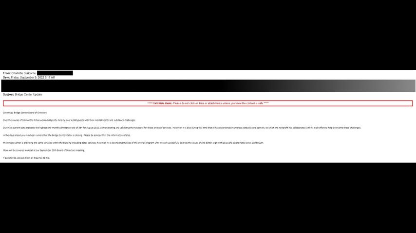 "I wouldn't say it's money trouble," Claiborne said. "We have a funding source issue. What I mean by that is the Bridge Center for Hope is the first ever crisis receiving center in Louisiana. Our license is 00001. When we opened we did not have a funding stream other than the property tax. We were always knowing we were going to have to go to the insurers and the state to help supplement the cost and that's where our issue is coming into play."