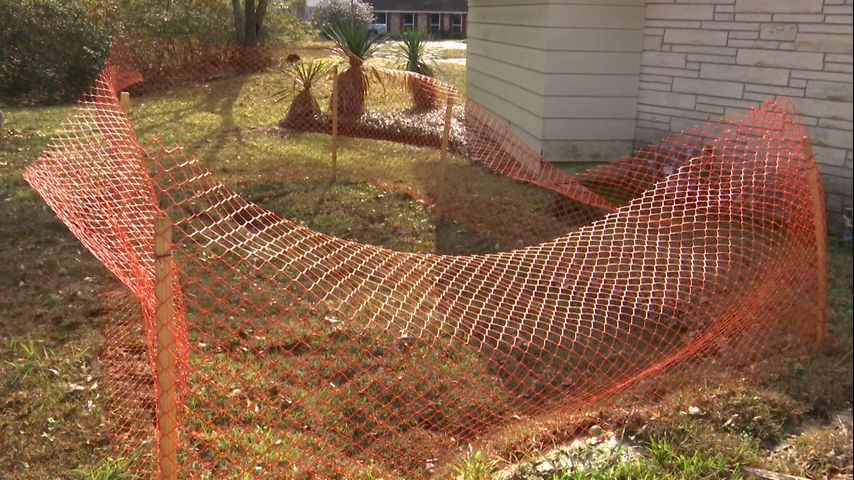The area is surrounded by stakes skirted with an orange plastic barricade. David Coco lives next to it and describes it as a 4x12' disaster.