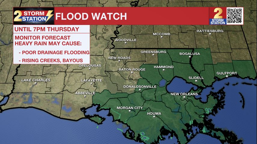 The FLOOD WATCH has been cancelled for Metro Baton Rouge and points northwest, but remains in effect for Ascension, Livingston, Tangipahoa, St. James, Assumption, and St. Mary Parishes until 7 p.m. Thursday.