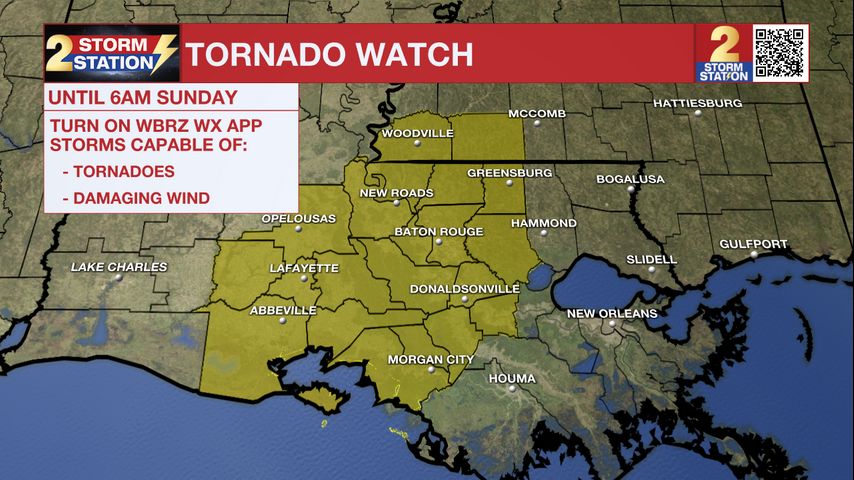 The National Weather Service has issued a ***TORNADO WATCH*** for East Baton Rouge, West Baton Rouge, Ascension, Assumption, Iberville, East Feliciana, Livingston, Pointe Coupee, St. Helena, St. James, St. Mary, and West Feliciana Parishes, as well as Amite and Wilkinson Counties until 6 a.m. Sunday.