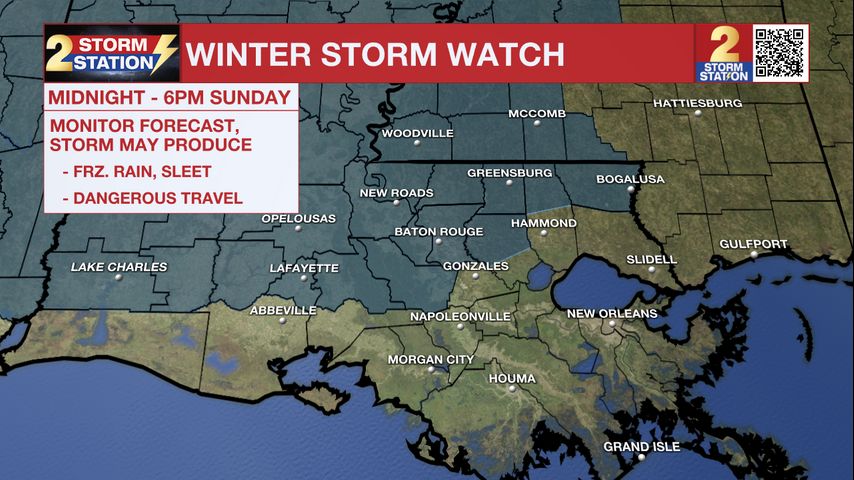 A ***WINTER STORM WATCH*** has been issued for East Baton Rouge, West Baton Rouge, Northern Livingston, Iberville, Pointe Coupee, West Feliciana, East Feliciana, St. Helena, and Northern Tangipahoa Parishes, as well as Amite and Wilkinson Counties for Sunday. This region highlights the "rain/freezing rain battleground" where there might be a changeover to freezing rain on Sunday. Total ice accumulations around one-tenth of an inch, with locally higher amounts up to one-quarter of an inch possible. Better chances of that occurring will be to the north and west of the I-10/12 corridor, per the latest trends. Monitor the latest forecasts for updates on this situation, as travel could become dangerous. The winter storm potential is discussed further in the Winter Storm Potential section below.
