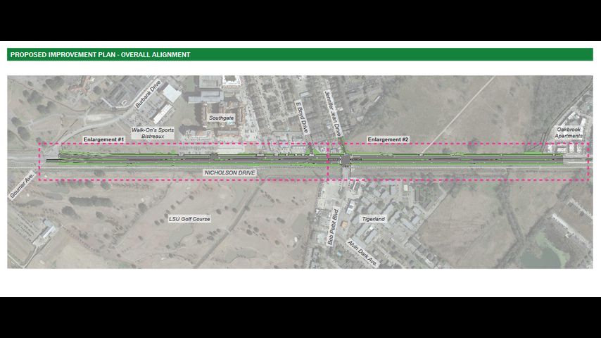 The first phase, of what is planned to be a three-phase project, will focus on Nicholson between Brightside Drive and Gourrier Avenue, along the edge of campus. According to city leaders with the MOVEBR project, the heavily-traveled street will be widened to four lanes with a median in the center, a 10-foot shared path, and bike lanes on either side. The plan will also include "J" turns that organizers believe will reduce left-turn crashes.