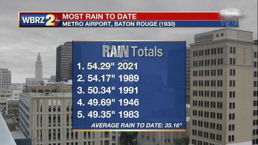 To date, Baton Rouge Metro Airport has registered 54.29 inches of rain making it the wettest year-to-date on record. 1989 had 54.17 inches inches by this point. Since 1930, Baton Rouge has averaged about 59 inches of rain per year. The wettest calendar on record was 2016 with 90.54 inches of rain.