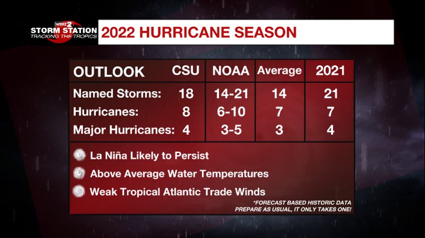 Annual averages are 14 named storms, 7 hurricanes and 3 major hurricanes. Earlier this year, another reputable research outfit at Colorado State University predicted 18 named storms and 8 hurricanes with 4 being considered major.