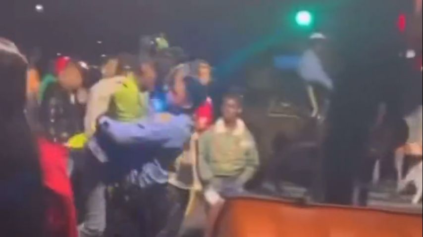 While walking away, he was hit by someone else and then shielded by two police horses.