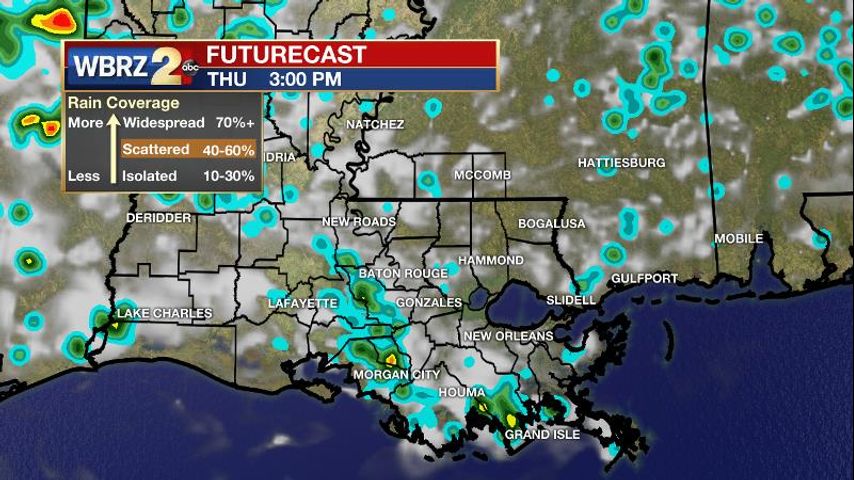 Today and Tonight: Temperatures will climb into the upper 80s by lunchtime with showers and thunderstorms developing on cue. Scattered activity is expected during the afternoon hours, but not as many locations within the 13 Parish, 3 County forecast area will receive rain as Wednesday. As per usual with summer storms, downpours and frequent lightning are possible. Overnight, thermometers will dip back into the mid 70s and showers end.