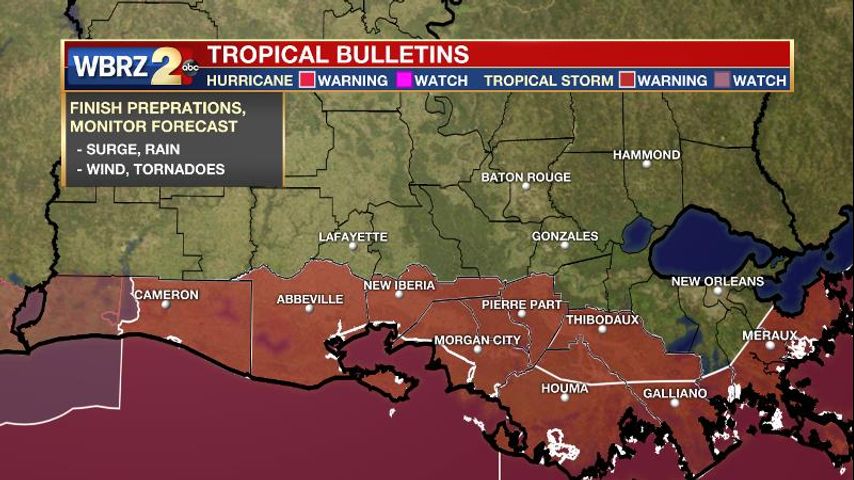 - A tropical storm warning is in effect for East Cameron, Iberia, Lower St. Martin, St. Mary, and Vermilion