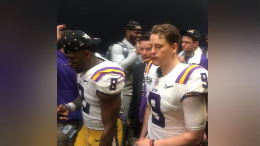 Joe Burrow sucking on a cigar and blowing smoke into the air while exiting the #LSU locker room is a thing that has happened. pic.twitter.com/9B0hzqz31M
