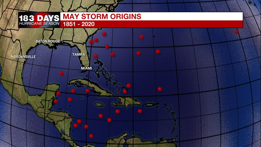 According to NOAA's historical hurricane tracker, 34 storms have formed during the month of May since 1851. In 2020, both Arthur and Bertha developed prior to June 1. Though most systems are weak at that time in the season, the strongest on record was a category two hurricane, later named Amanda, that struck Florida in 1863.